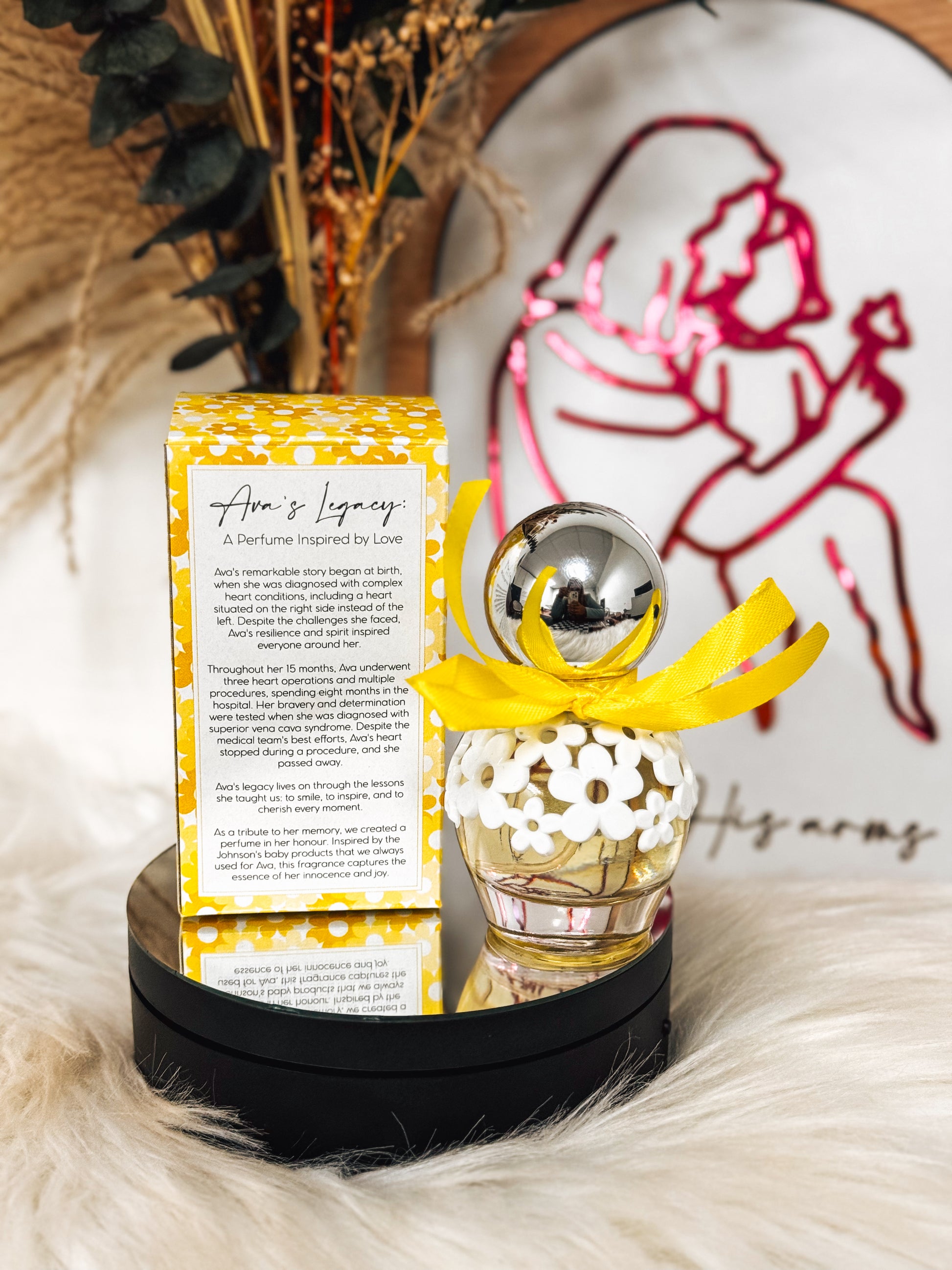 Ava's Perfume is presented in a stunning 30ml glass bottle, adorned with delicate daisies and finished with a vibrant yellow ribbon. The ribbon serves as a poignant reminder of Ava's courageous spirit and her status as a true warrior.